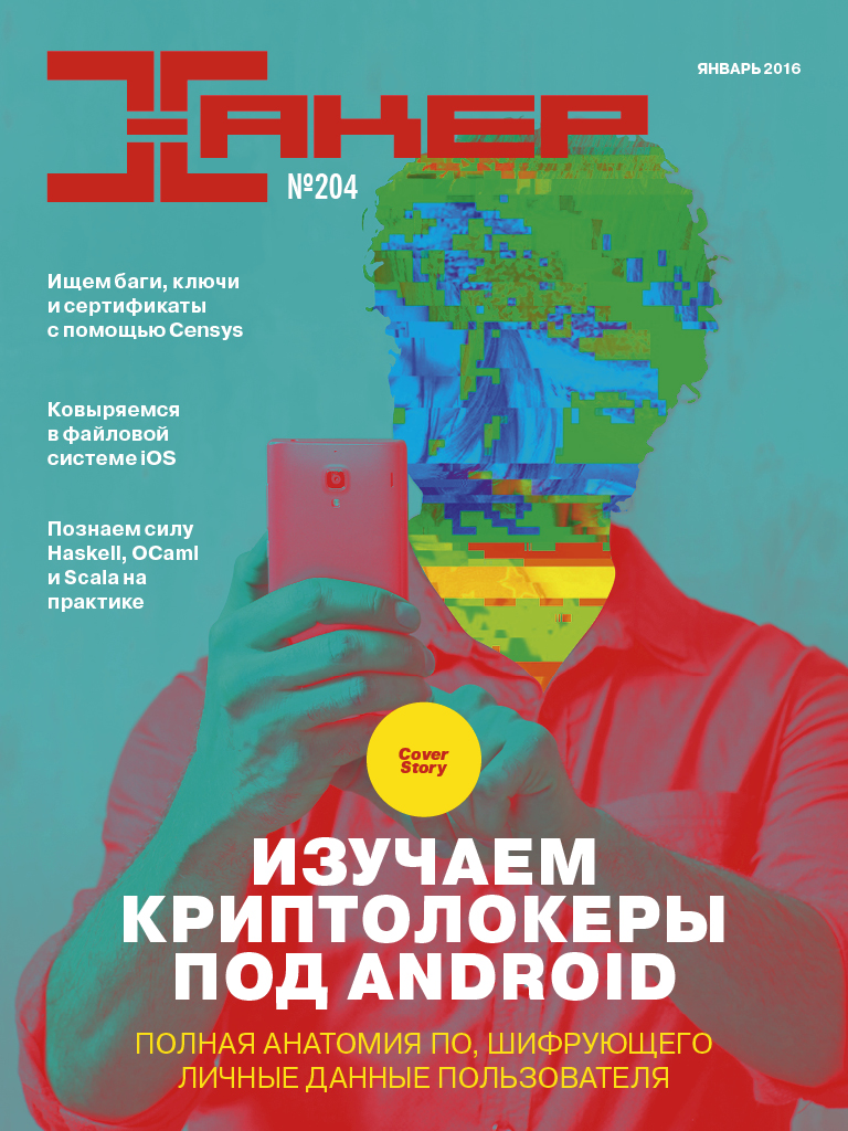 -60% Оформить подписку на «Хакер»: 4500 руб на 1 год 450 руб на 1 месяц Хакер #204. Шифровальщик для Android В продаже с 1 января HEADER MEGANEWS. Всё новое за последний месяц COVER STORY Шифровальщик для Android. Полная анатомия ПО, шифрующего личные данные пользователя PC ZONE Правильный кроп. Подборка полезностей для разработчиков Censys: на что способен «бесплатный Shodan». Ищем уязвимости, ключи и сертификаты новым поисковиком WWW2. Интересные веб-сервисы СЦЕНА В поисках Сатоси Накамото. Как ищут загадочного создателя Bitcoin Как устроен антифрод. История о русских ботах, аукционных ворах и краденых миллиардах X-MOBILE Дозируй батарею правильно. Разбираемся в механизмах работы и тюнингуем режим энергосбережения Doze Tips’n’tricks из арсенала андроидовода. Скрытые возможности Android, о которых должен знать каждый Нарезаем яблоки. Что внутри файловой системы iOS Карманный софт. Выпуск #15. Средства прошивки и обновления Android на нетбуке? Колонка Евгения Зобнина ВЗЛОМ Easy Hack. Хакерские секреты простых вещей Обзор эксплоитов. Анализ свеженьких уязвимостей Страх, неизвестность, сомнения. Колонка Юрия Гольцева ESIL + radeco IL. Используем промежуточные представления проекта radare2 для эмуляции и декомпиляции X-TOOLS. Софт для взлома и анализа безопасности MALWARE Самая интересная малварь — 2015. Automotive Exploit, Carbanak, Cryptowall, Equation КОДИНГ Разрешения Android 6.0 в защите и нападении. Вежливость — главное оружие вора! Атомная бомба для C++ кодера. Обзор набора фреймворков массового поражения (включая Arduino!) Делаем интерпретатор по-функциональному. Познаем силу Haskell, OCaml и Scala на практике UNIXOID Подводим итоги. Дайджест событий в мире Open Source за год Использование средств криптографической защиты в ОС FreeBSD. Часть 2. Тонкости повседневного использования SYN/ACK Путь в Сеть. Разбираемся с настройками Border Gateway Protocol в Windows Server 2012 R2 / 2016 Админим с комфортом. Разбираемся с веб-панелями управления Linux-сервером UNITS FAQ. Вопросы и ответы Титры. Кто делает этот журнал